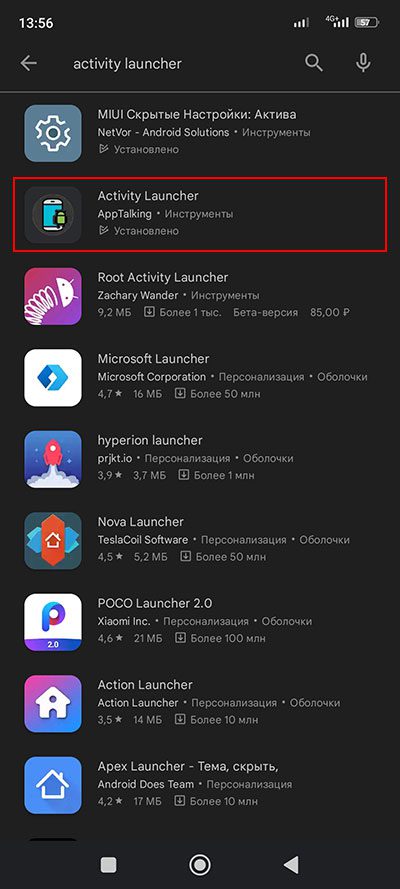- Запускаем Activity Launcher, MIUI Скрытые настройки: Актива или любое другое подобное приложение с аналогичными возможностями;
