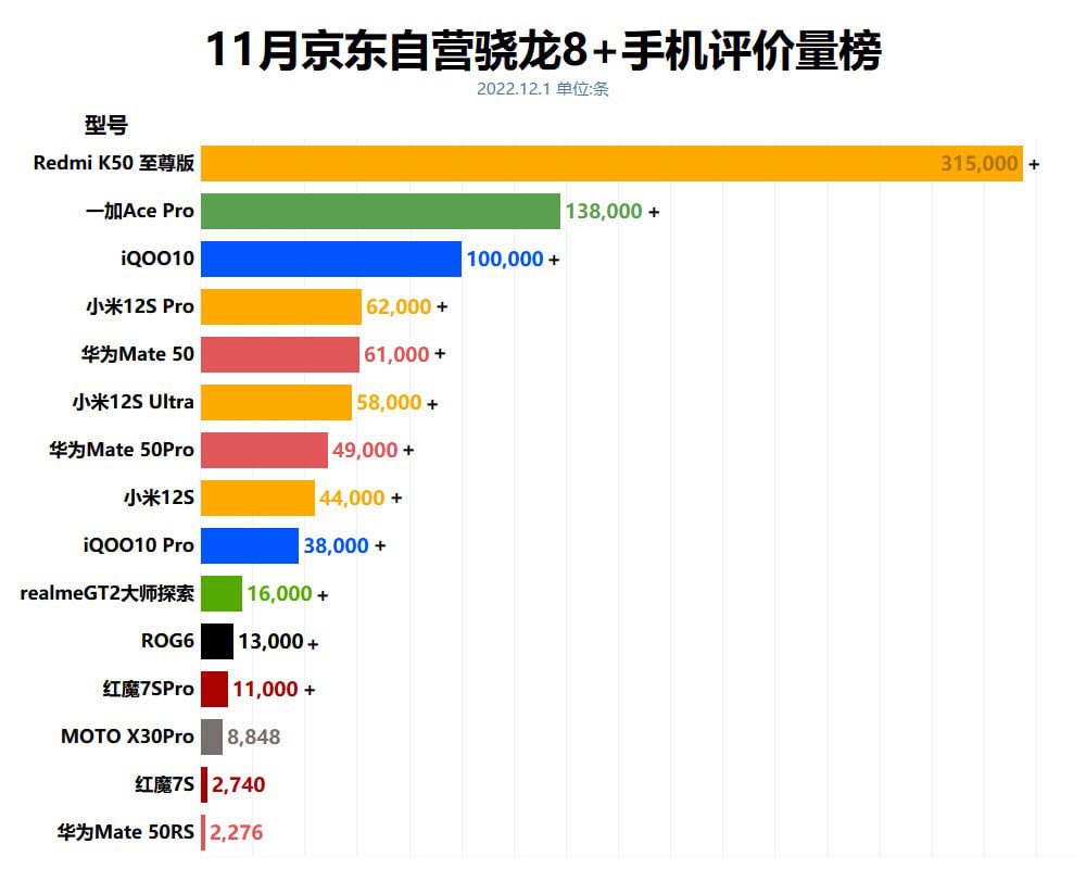 К примеру, на днях известная онлайн-площадка jd.сом поделилась своей статистикой по продажам смартфонов в октябре и ноябре текущего года. Как видно на опубликованных графиках, Redmi K50 Extreme Edition в ноябре месяце стал абсолютным хитом, более чем вдвое опередившим не менее популярный OnePlus Ace Pro.