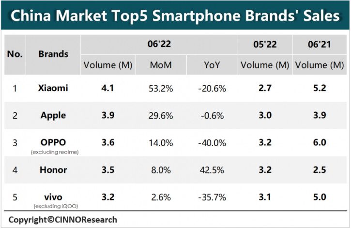 Падают продажи смартфонов и у Xiaomi, хотя и не так быстро, как у BBK — на 20,6% по итогам месяца, на 25,1% по итогам квартала и на 23,9% по итогам полугодия.